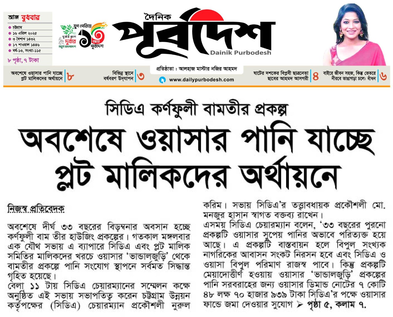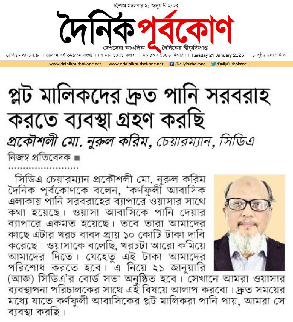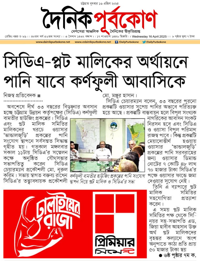 | ১৬-০৪-২০২৫ | সিডিএ প্লট মালিকদের অর্থায়নে পানি যাবে কর্ণফুলী আবাসিকে | দেখুন |