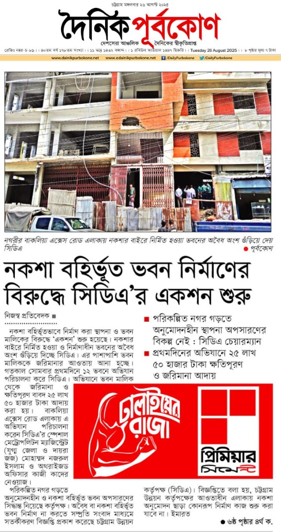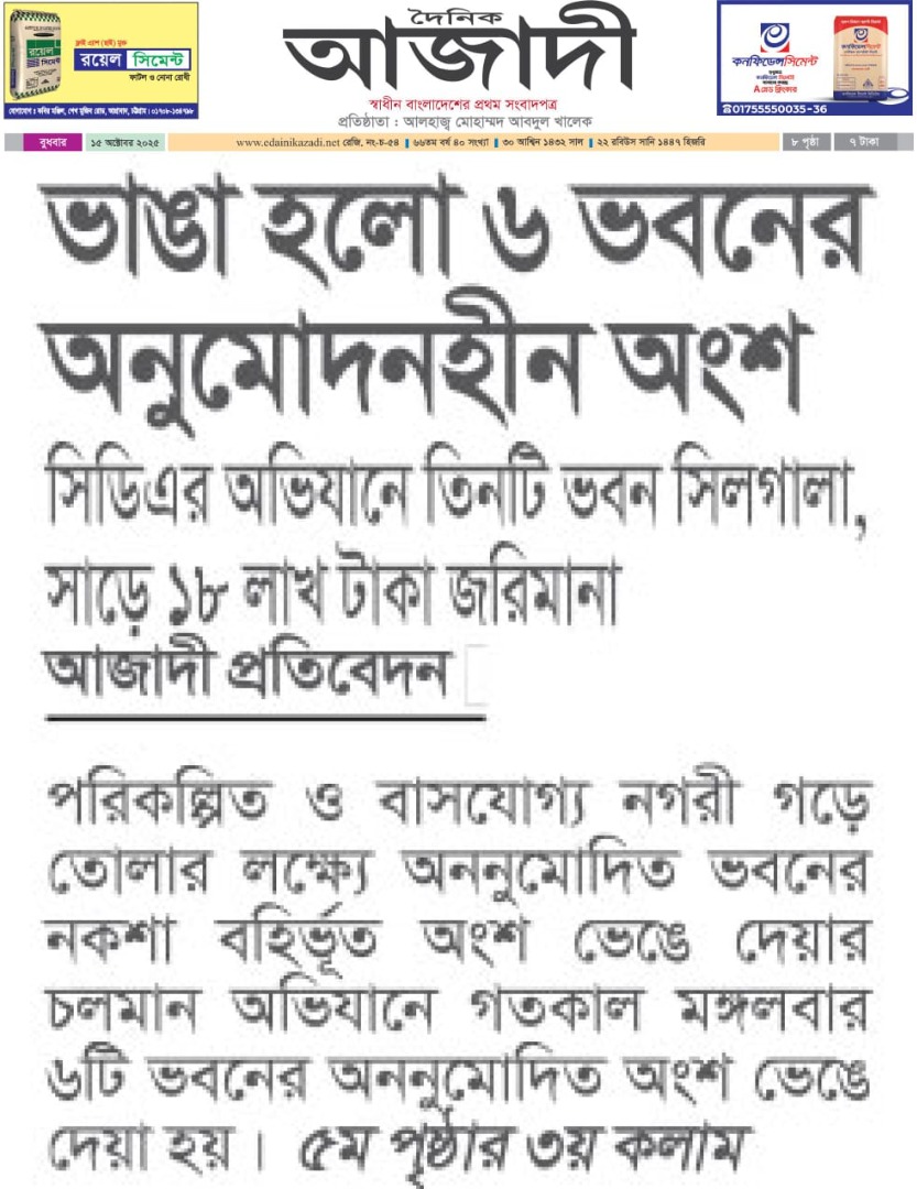 | ২৬-০৮-২০২৫ | নকশা বহির্ভূত ভবন নির্মাণের বিরুদ্ধে সিডিএ'র একশন শুরু | দেখুন |