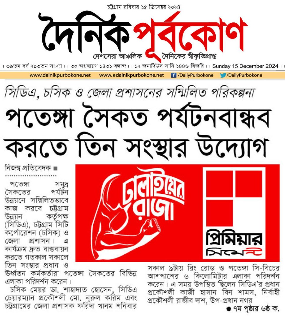| ১৫-১২-২০২৪ | পতেঙ্গা সৈকত পর্যটনবান্ধব করতে তিন সংস্থার উদ্যেগ | দেখুন |