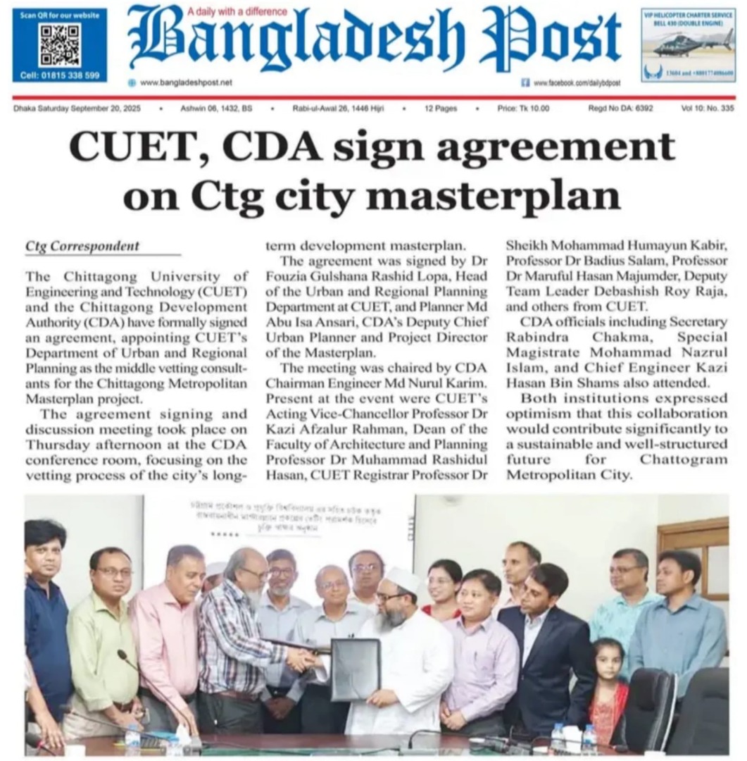| ২০-০৯-২০২৫ | চট্টগ্রাম নগরীর মাস্টারপ্ল্যান তৈরিতে চুয়েট এবং সিডিএ’র মধ্যে চুক্তি স্বাক্ষর | দেখুন |