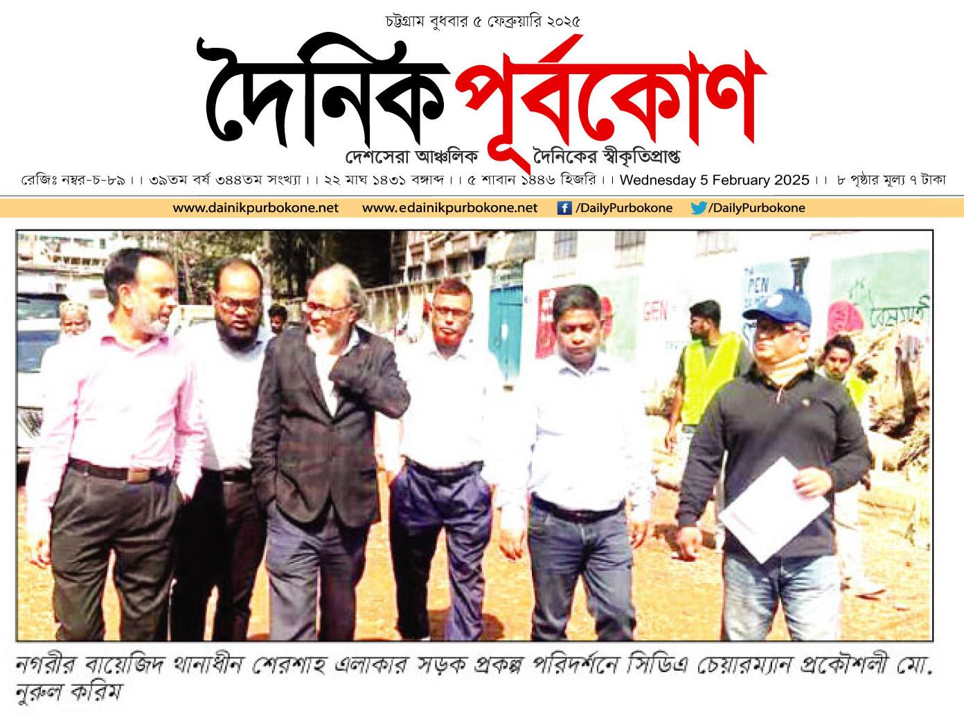 | ০৫-০২-২০২৫ | নগরীর বায়েজিদ থানাধীন শেরশাহ এলাকায় সড়ক প্রকল্প পরিদর্শনে সিডিএ চেয়ারম্যন | দেখুন |