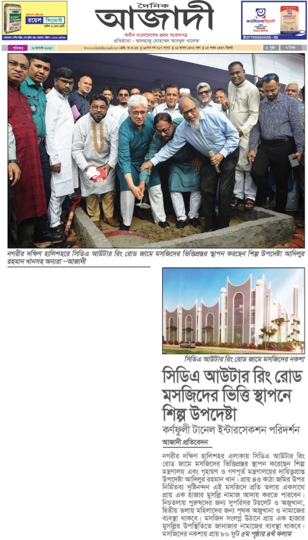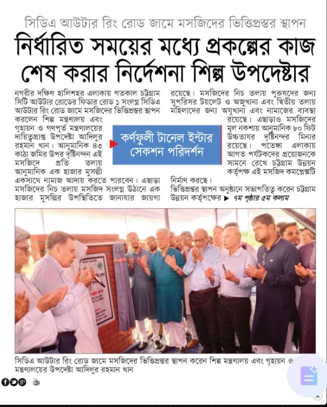 | ০৯-০৮-২০২৫ | সিডিএ আউটার রিং রোড জামে মসজিনের ভিত্তিপ্রস্তর স্থাপন | দেখুন |
