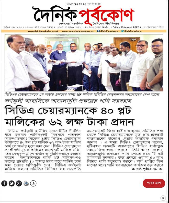 | ২৪-০৮-২০২৫ | সিডিএ চেয়ারম্যানকে ৪০ প্লট মালিকের ৬২ লক্ষ টাকা প্রদান | দেখুন |