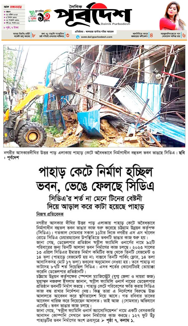 | ১৬-১২-২০২৫ | সিডিএ'র উচ্ছেদ অভিযানে নকশা বহির্ভূত ভবনের অবৈধ অংশ ভেঙ্গে ফেলা হয় | দেখুন |
