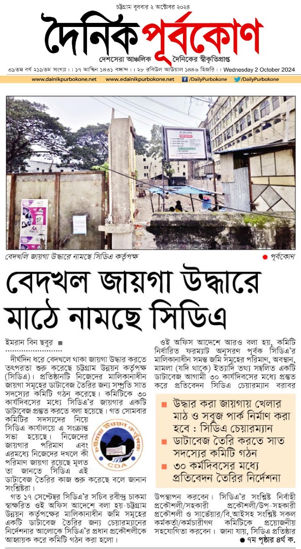 | ০২-১০-২০২৪ | বেদখলি জায়গা উদ্ধারে নামছে সিডিএ | দেখুন |