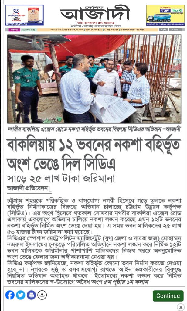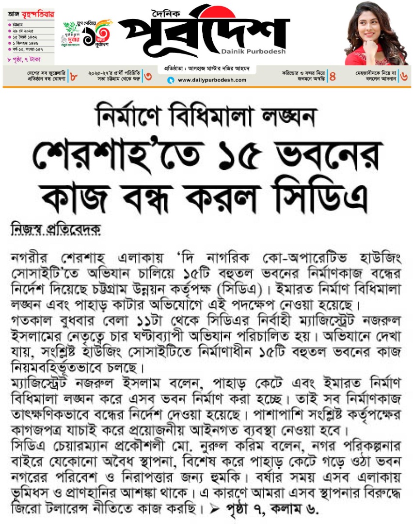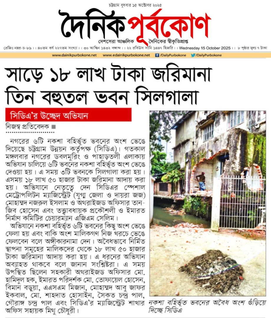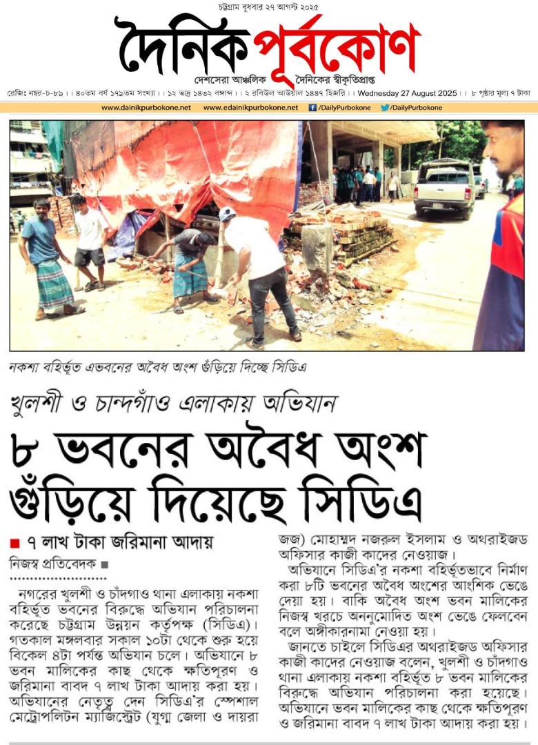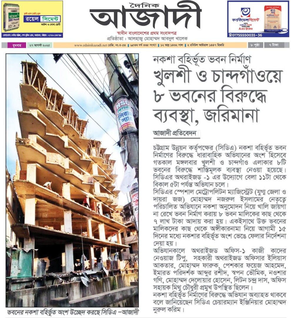 | ২৭-০৮-২০২৫ | খুলশী ও চান্দগাঁওয়ে ৮ ভবনের বিরুদ্ধে ব্যবস্থা , জরিমানা | দেখুন |