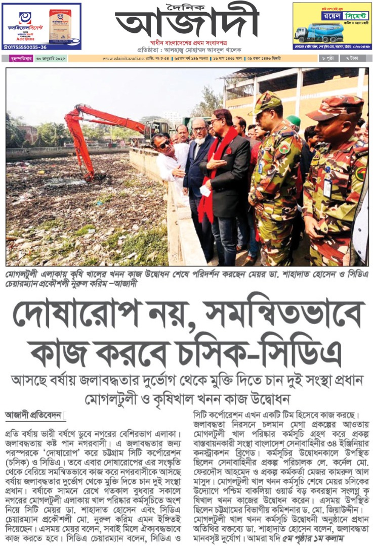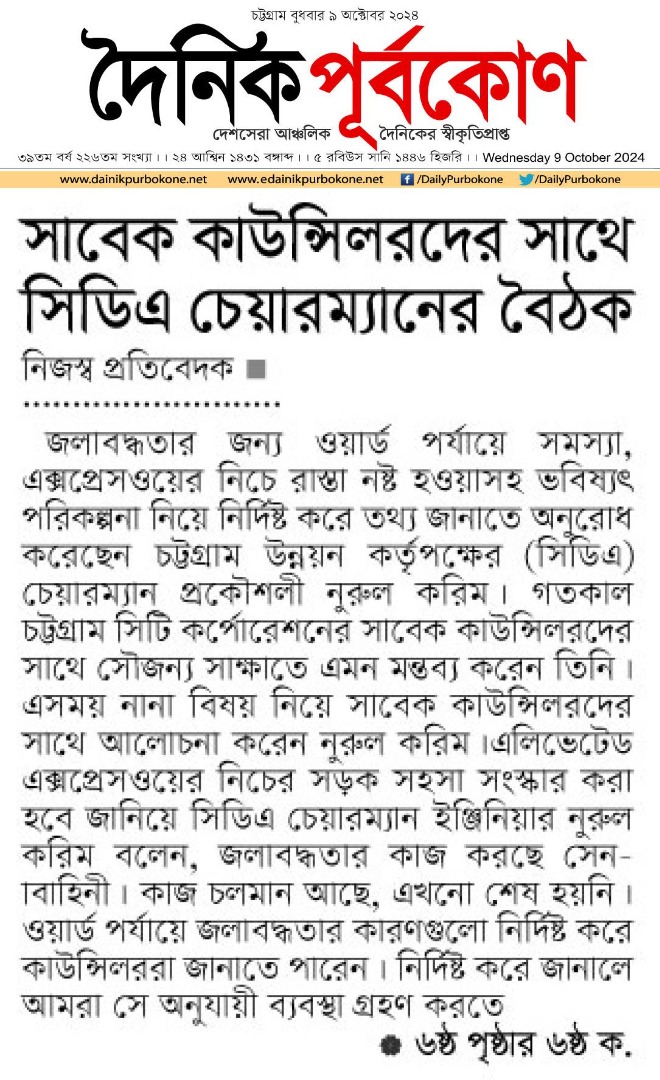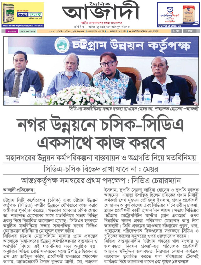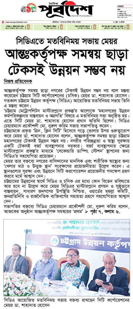 | ২৫-১১-২০২৪ | নগর উন্নয়নে চসিক-সিডিএ একসাথে কাজ করবে | দেখুন |