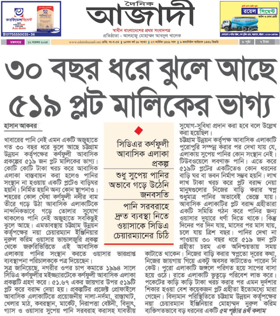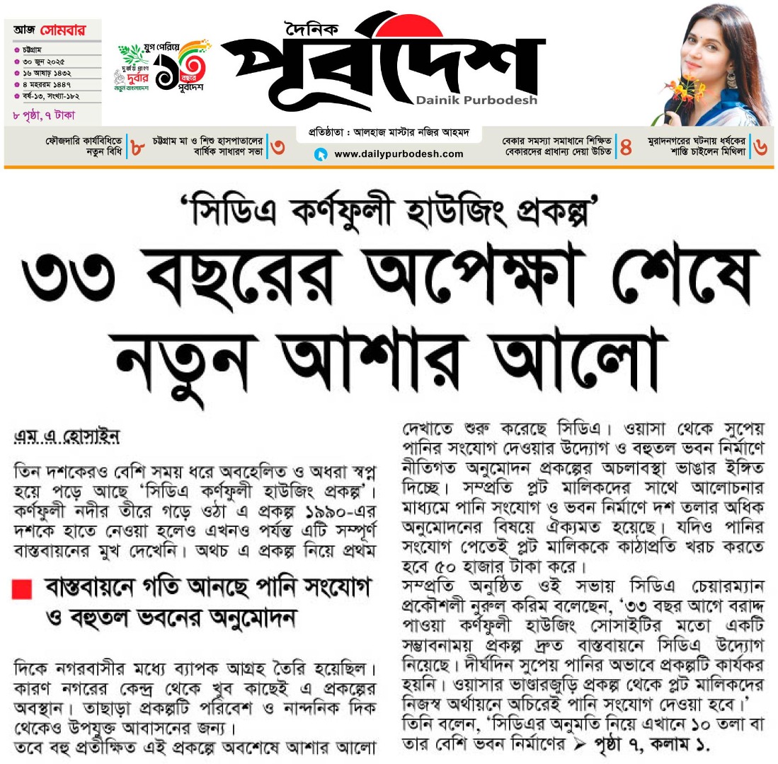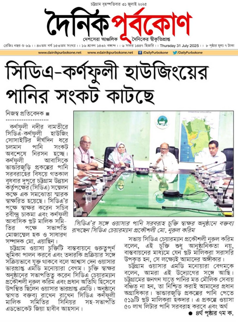 | ৩১-০৭-২০২৫ | সিডিএ-কর্ণফুলী হাউজিংয়ের পানির সংকট কাটছে | দেখুন |