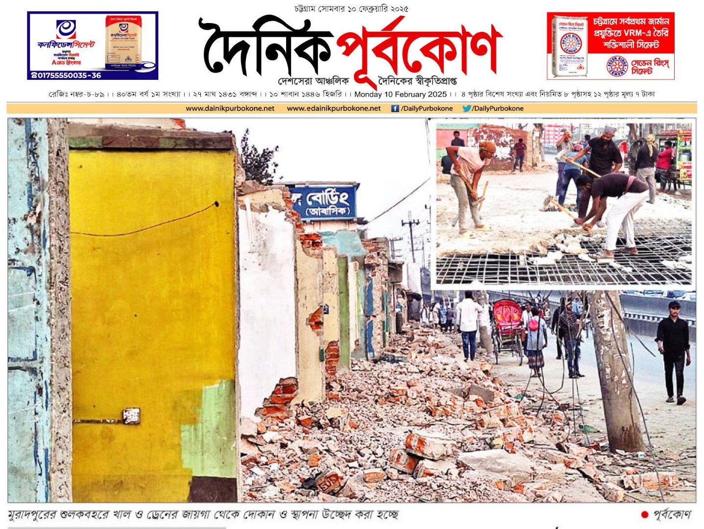 | ১০-০২-২০২৫ | মুরাদপুরের শুলকবহরে খাল ও ড্রেনের জায়গা থেকে দোকান ও স্থাপনা উচ্ছেদ | দেখুন |