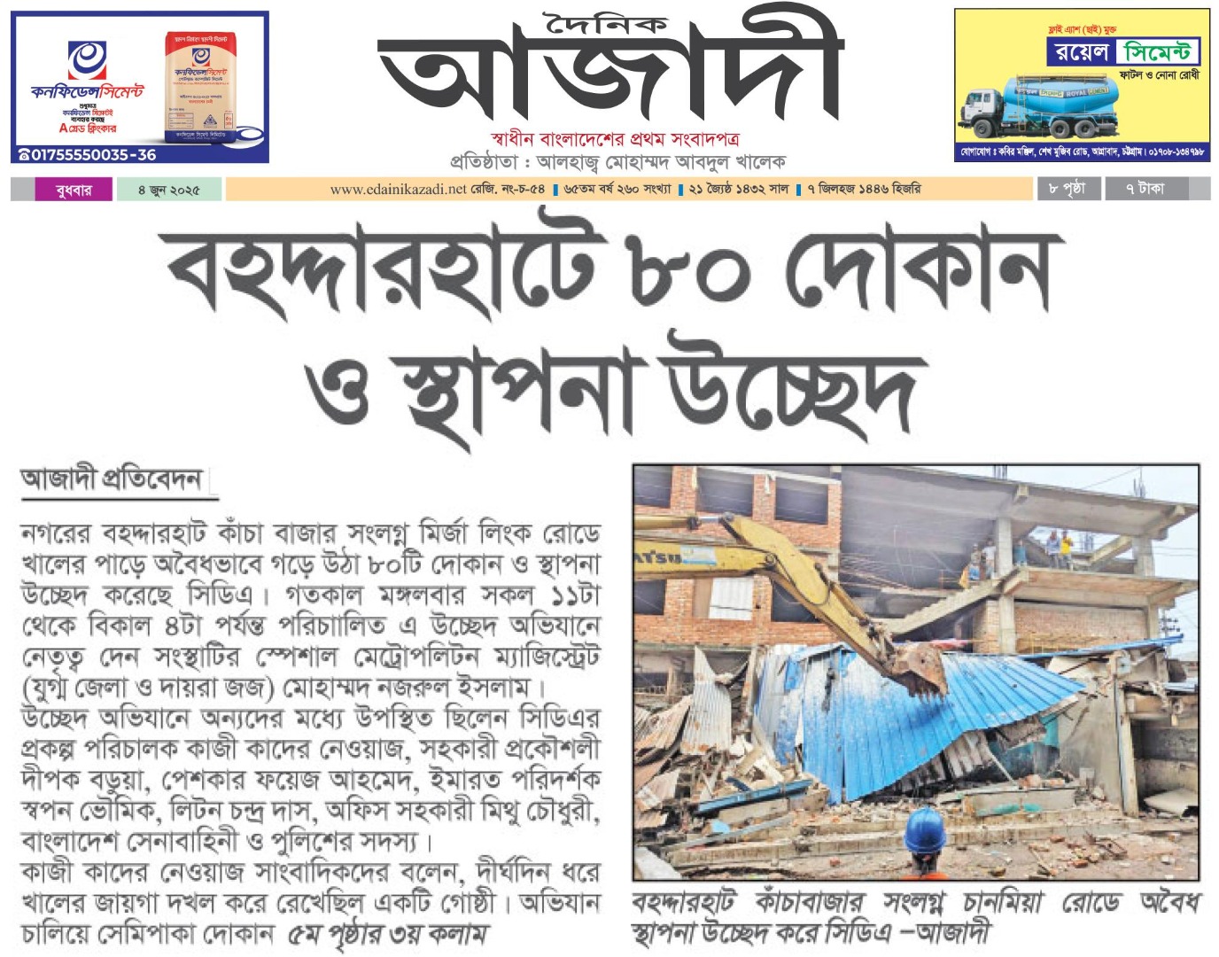| ০৪-০৬-২০২৫ | বহদ্দারহাটে ৮০ দোকান উচ্ছেদ | দেখুন |