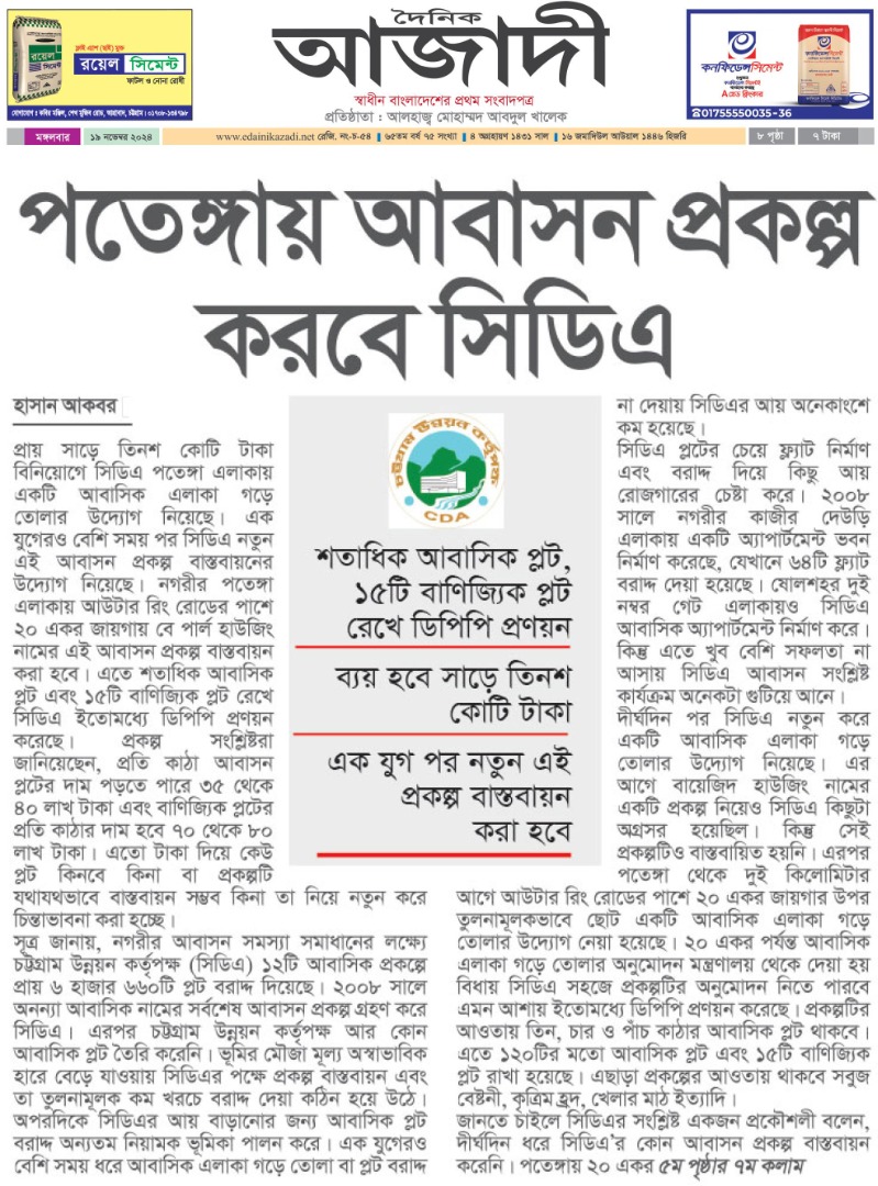 | ১৯-১১-২০২৪ | পতেঙ্গায় আবাসন প্রকল্প করবে সিডিএ | দেখুন |