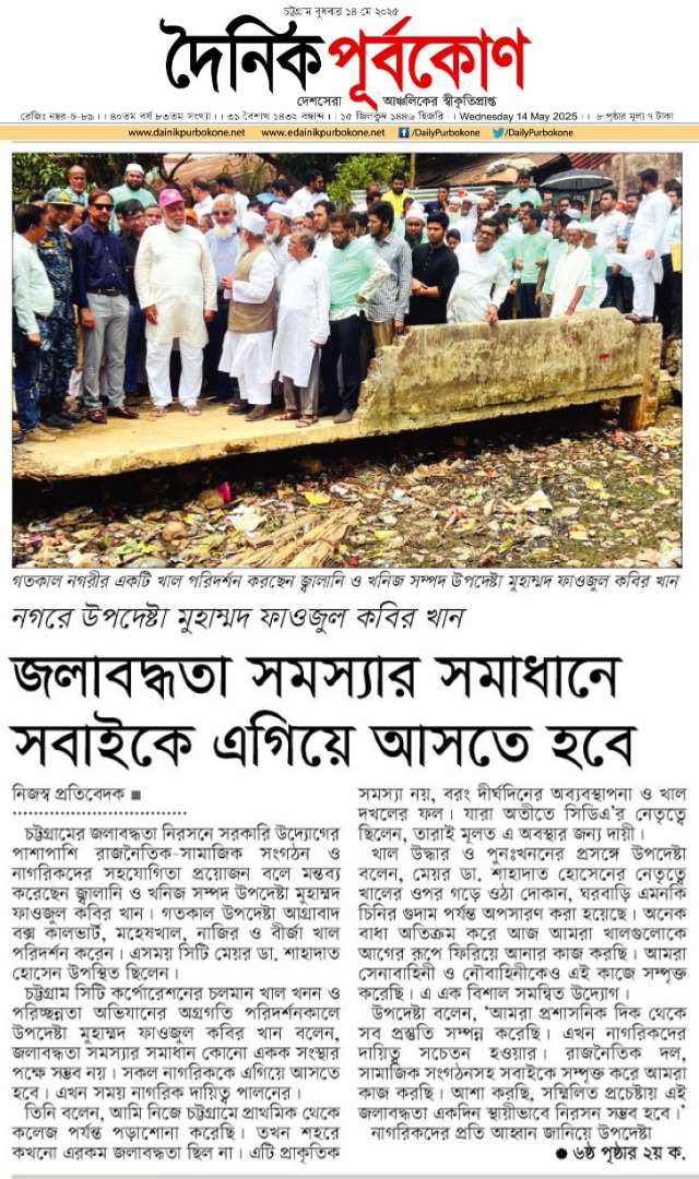 | ১৪-০৫-২০২৫ | জলাবদ্ধতা সমস্যার সমাধানে সবাইকে এগিয়ে আসতে হবে | দেখুন |