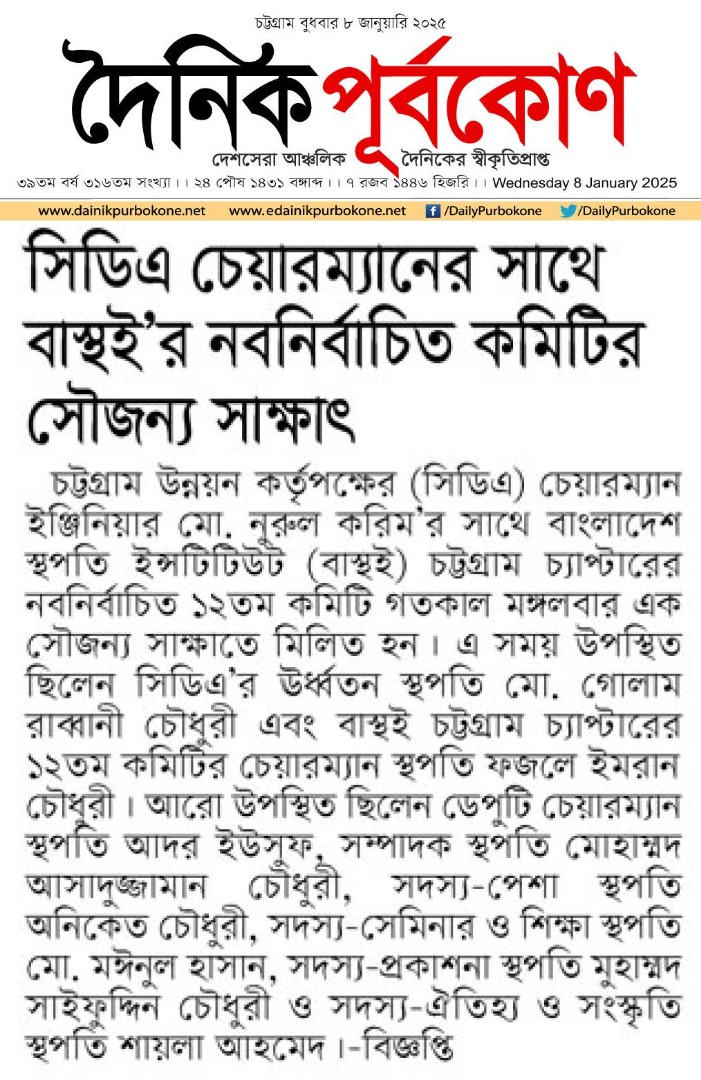 | ০৮-০১-২০২৫ | সিডিএ চেয়ারম্যনের সাথে বাস্থই'র নবনির্বাচিত কমিটির সৌজন্য সাক্ষাৎ | দেখুন |