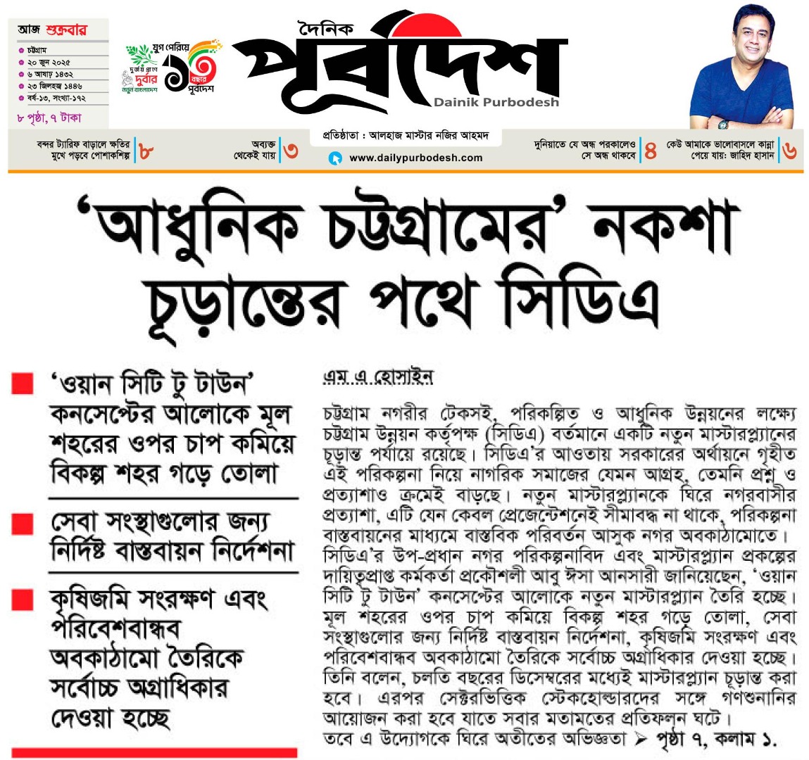| ২০-০৬-২০২৫ | আধুনিক চট্টগ্রামের নকশা চূড়ান্তের পথে সিডিএ | দেখুন |