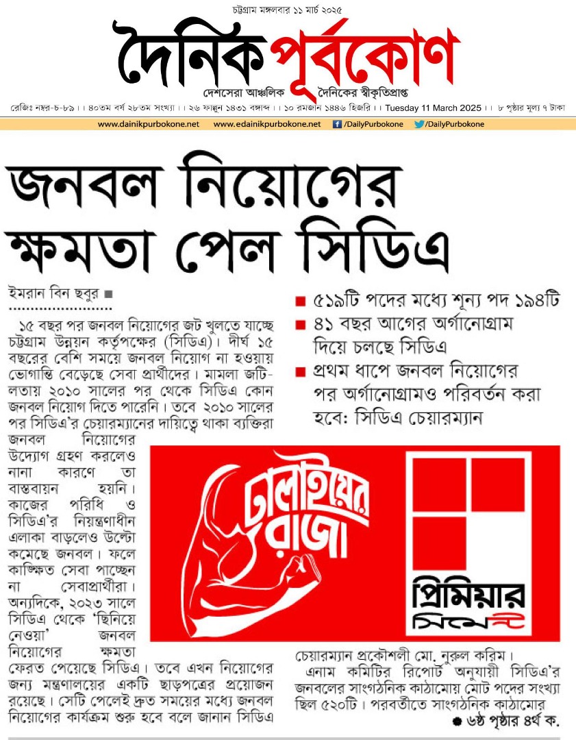 | ১১-০৩-২০২৫ | জনবল নিয়োগের ক্ষ্মতা পেল সিডিএ | দেখুন |