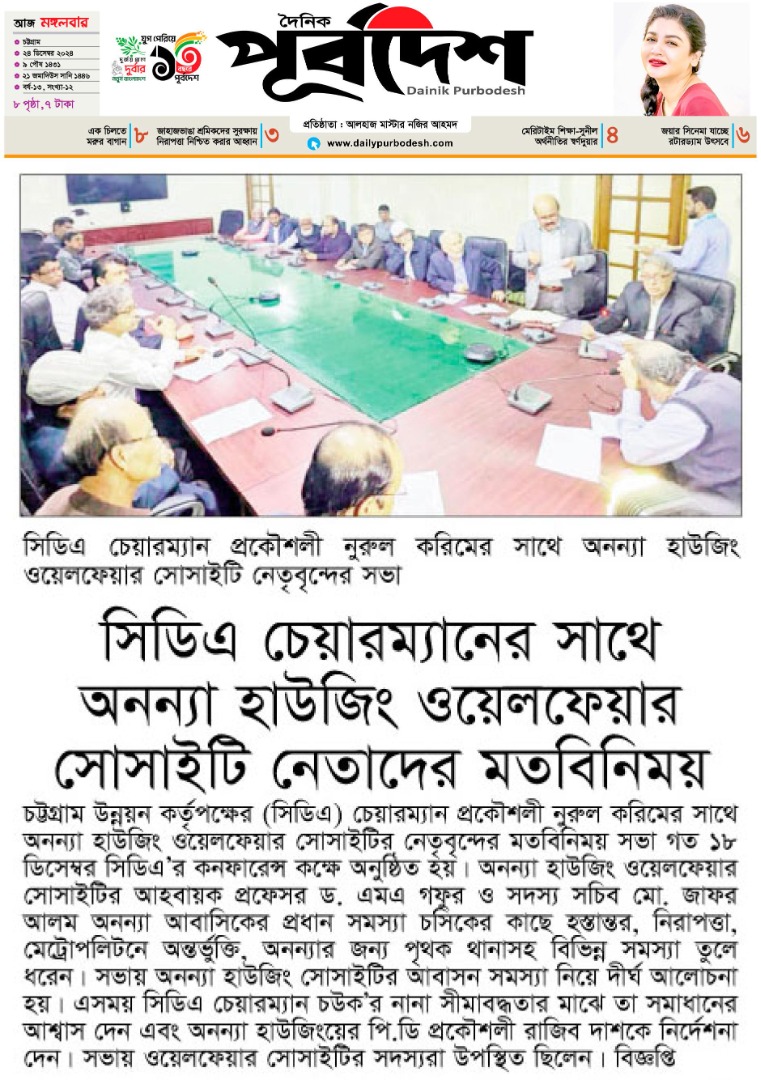| ২৪-১২-২০২৪ | সিডিএ চেয়ারম্যানের সাথে অনন্যা হাউজিং ওয়েল ফেয়ার সোসাইটির নেতাদের মতবিনিময় | দেখুন |