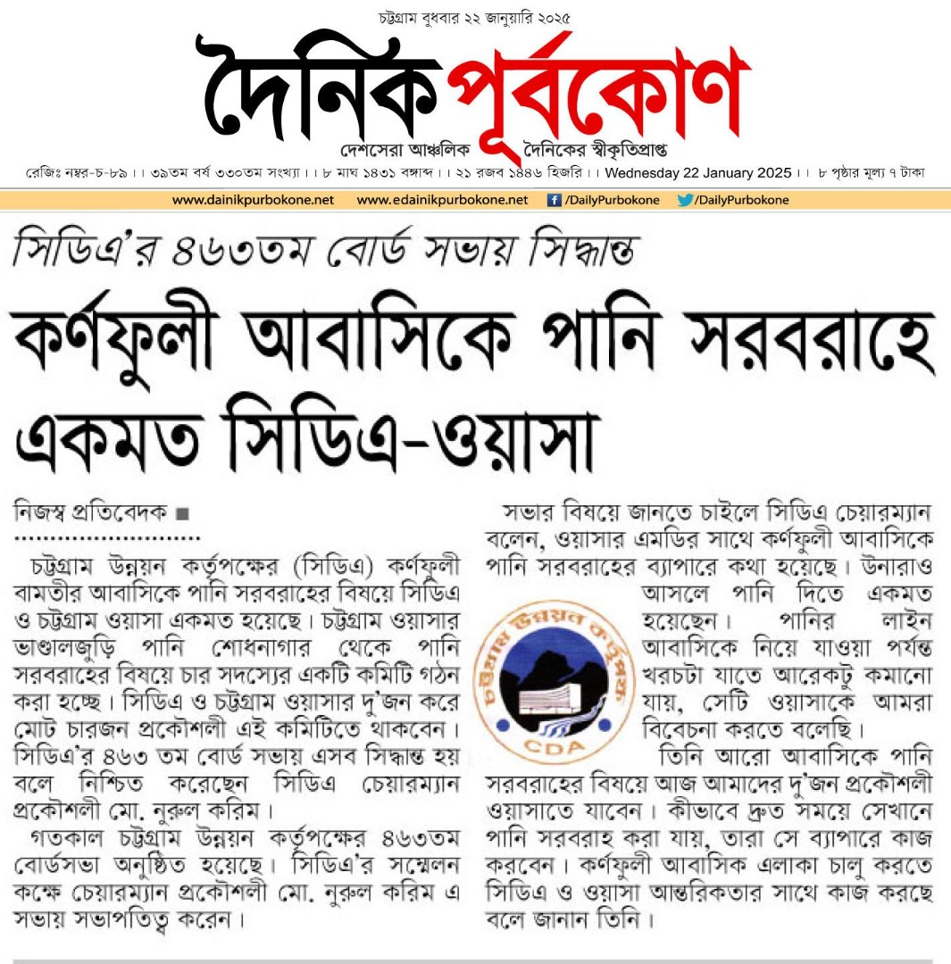 | ২২-০১-২০২৫ | কর্ণফুলী আবাসিকে পানি সরবরাহে একমত সিডিএ ওয়াসা | দেখুন |