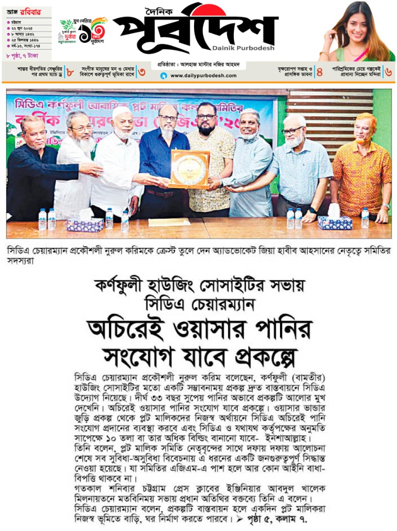 | ২২-০৬-২০২৫ | কর্ণফুলী হাউজিং সোসাইটির সভায় সিডিএ চেয়ারম্যান | দেখুন |