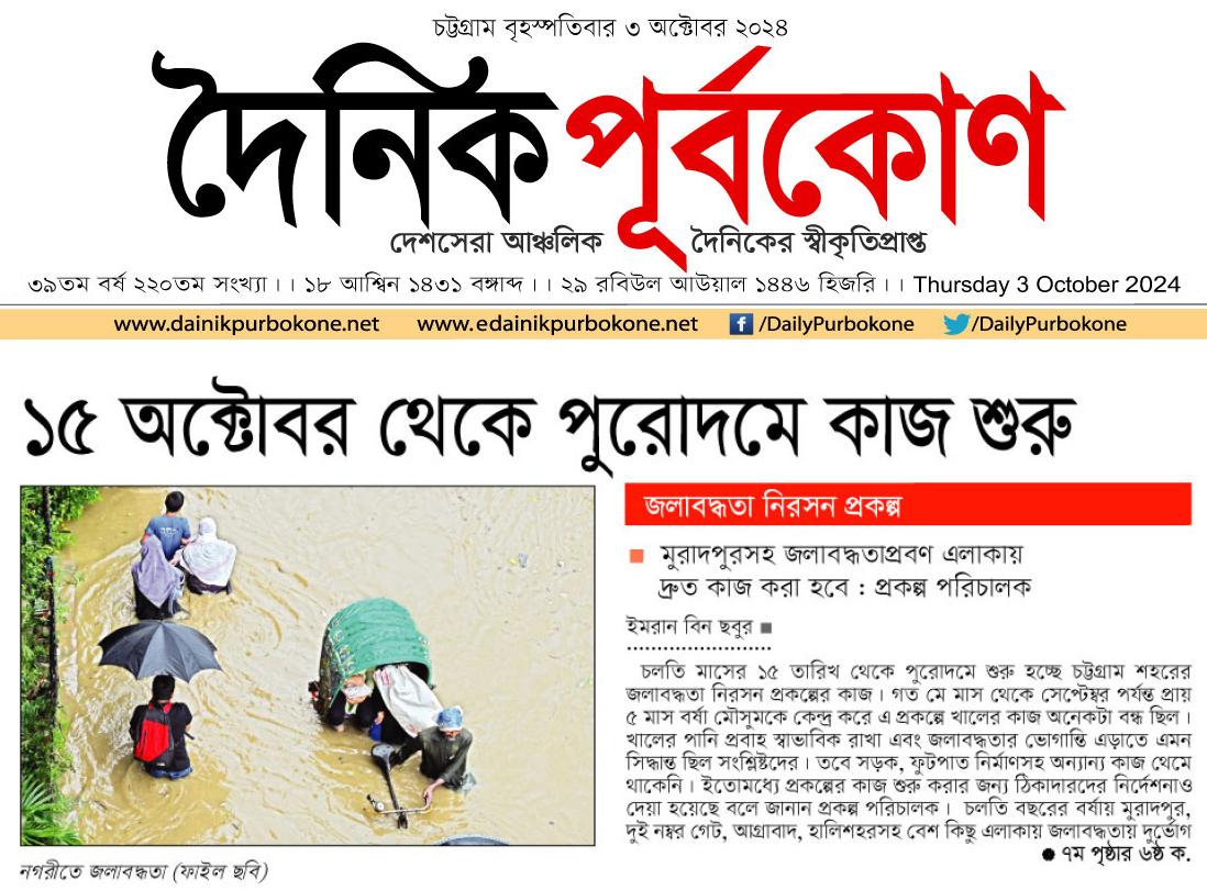 | ০৩-১০-২০২৪ | জলাবদ্ধতা নিরসনে ১৫ অক্টোবর থেকে পুরোদমে কাজ শুরু | দেখুন |