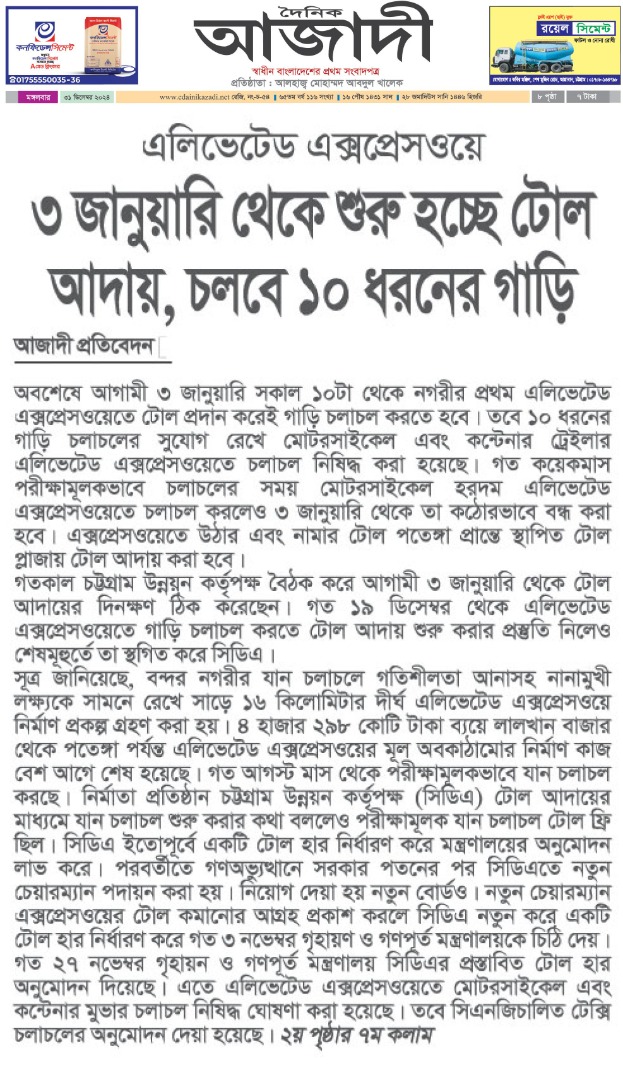 | ৩১-১২-২০২৪ | এলিভাটেড এক্সপ্রেসওয়েতে ৩ জানুয়ারি থেকে শুরু হচ্ছে টোল আদায় | দেখুন |