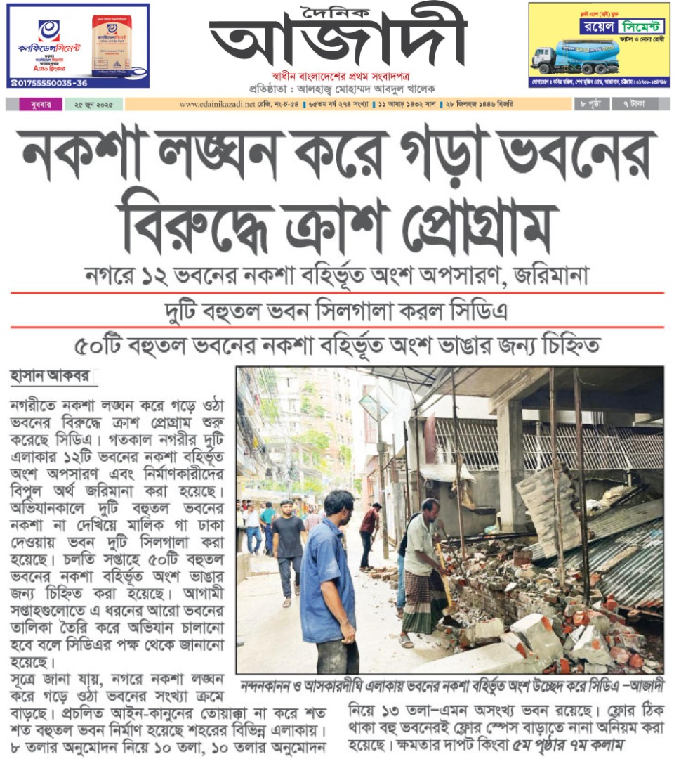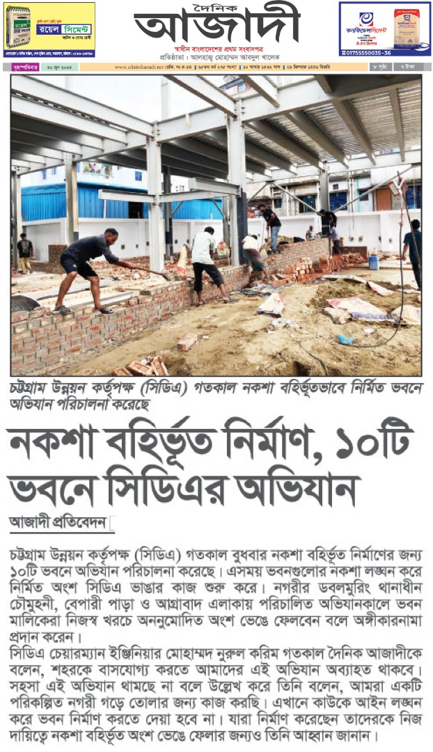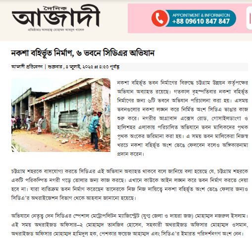 | ০৪/০৭/২০২৫ | ![]() | নকশা বহির্ভূত নির্মাণ, ৬ ভবনে উচ্ছেদ অভিযান। | ডাউনলোড | ![]() |